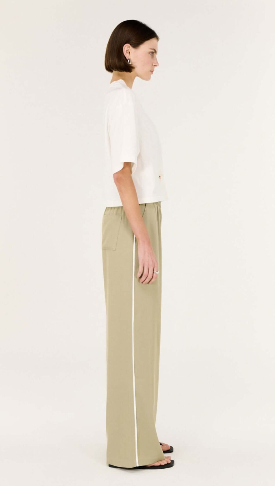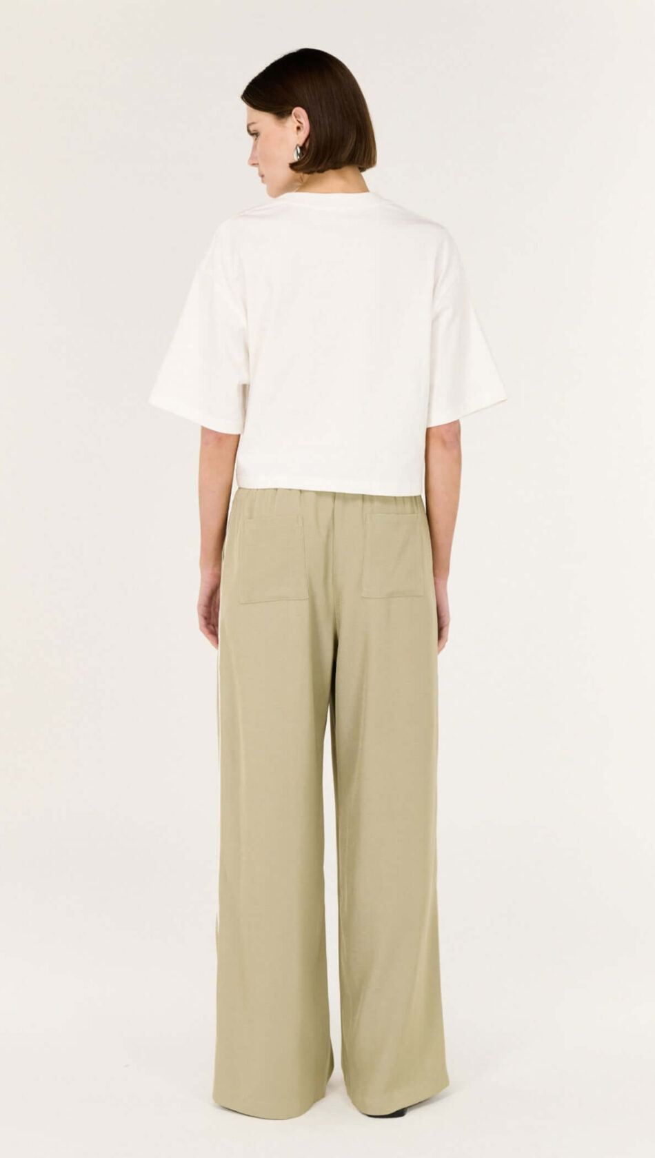 The Dion Sage Relaxed Track Pant is an easy, relaxed track style designed for all-day comfort with a refined edge. Featuring an elasticated waistband and wide-leg silhouette, these pants fall fluidly through the leg for an effortless fit. Finished with a subtle contrast side stripe, they offer a modern take on casual dressing. Wear with the Lune Crop Tee or a fitted tank for a clean, contemporary look.
