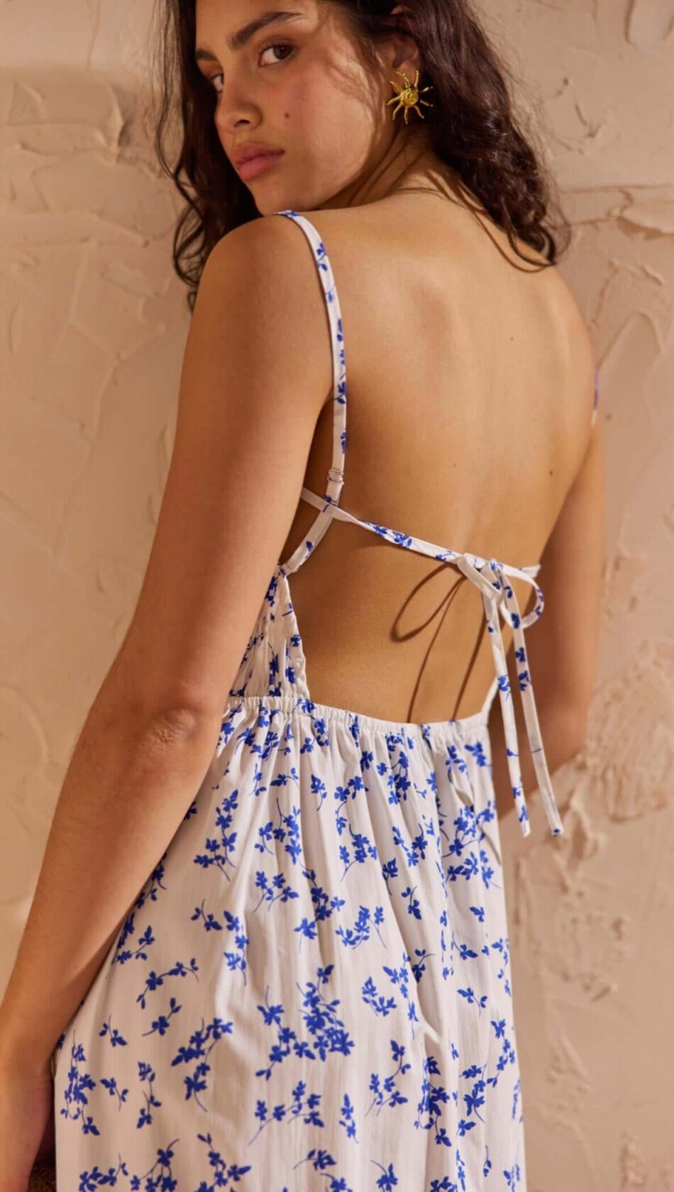 The Florence Blue Floral Cotton Backless Midi Dress is an effortless statement piece designed for warm days and balmy nights. Crafted from breathable cotton poplin, this floral midi dress features a soft ditzy floral print and a flattering, feminine silhouette.