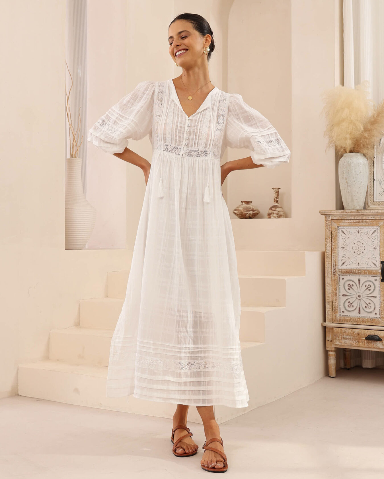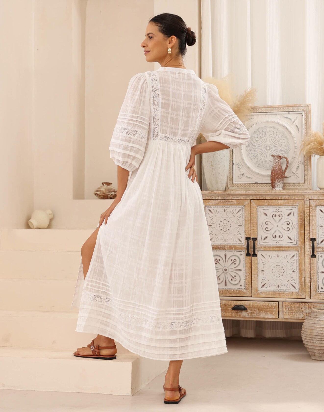 ENHANCE WHITE COTTON BALLOON SLEEVE MIDI DRESS